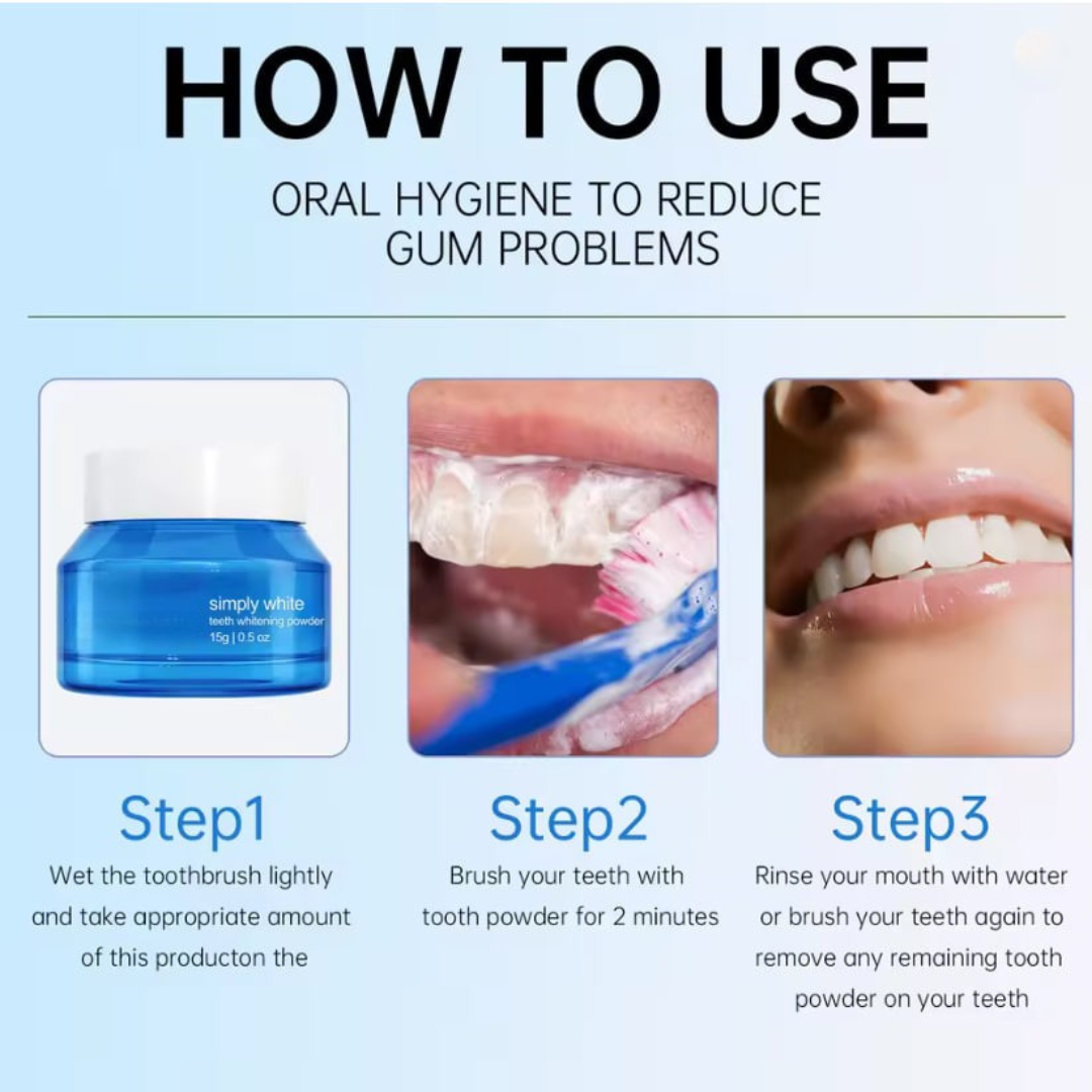 Simply dip your wet toothbrush into the finely milled Simply White Teeth Whitening Powder. The advanced PAP+ formula activates upon contact, safely targeting and removing surface stains without harsh peroxides or causing sensitivity.